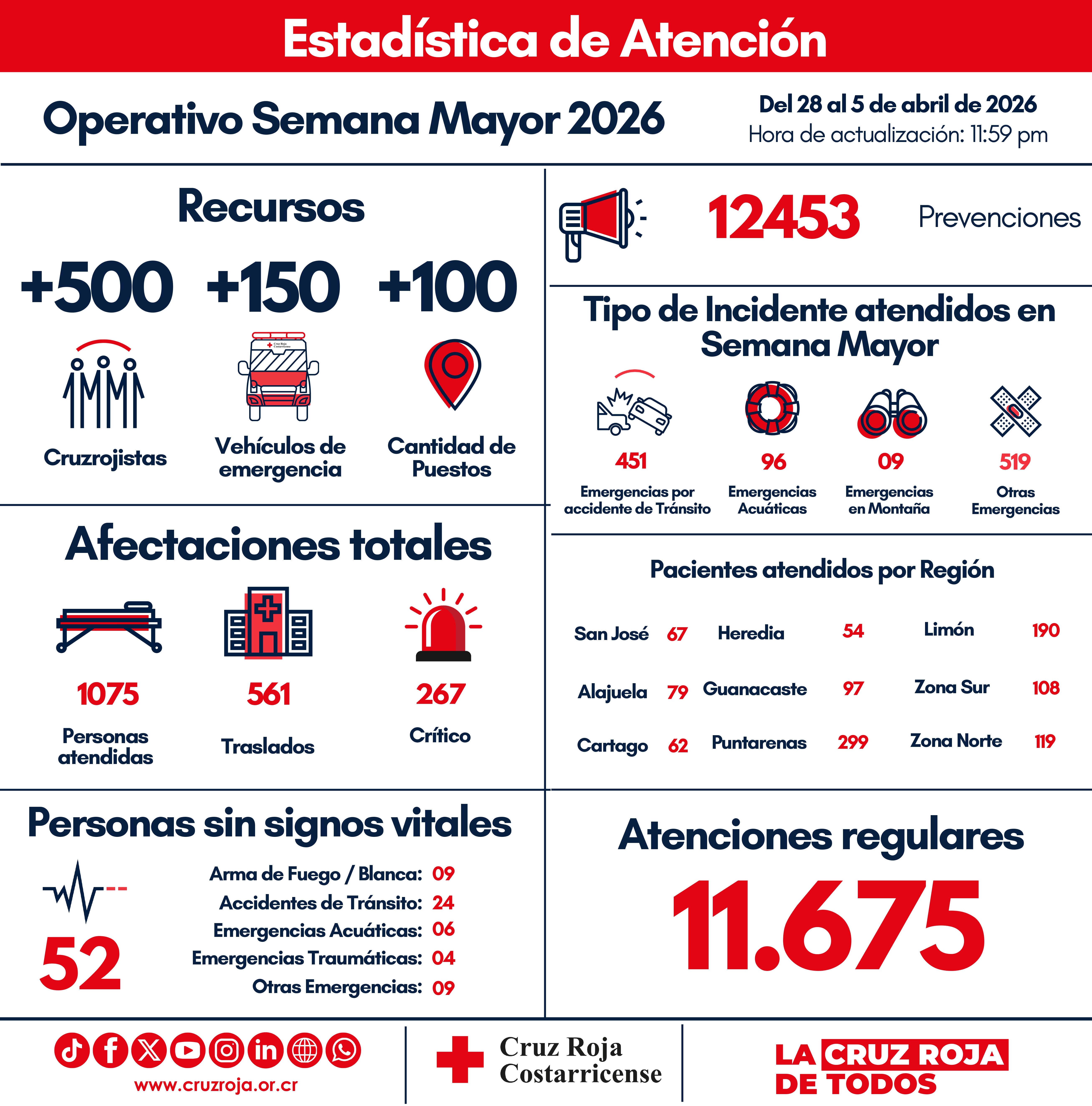 06 de abril de 2026. La Cruz Roja Costarricense presenta el balance del operativo de Semana Mayor 2026, evidenciando un escenario de mayor demanda en la atención de emergencias, pero con un resultado positivo en la reducción de la mortalidad.